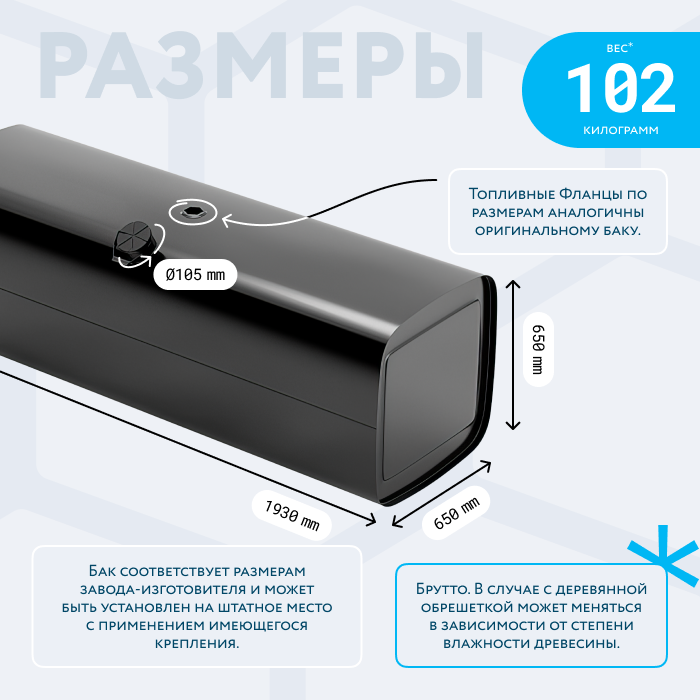- Так же, если вы приобретаете алюминиевый топливный бак, он будет в деревянной обрешетке (для усиления защиты при транспортировке). При просчете веса и объема, цена за доставку может измениться по факту взвешивания на самом терминале транспортной компании. Так как деревянная обрешетка соответственно изготовлена из древесины, и она имеет свойство значительно набирать вес в зависимости от влажности окружающей среды.